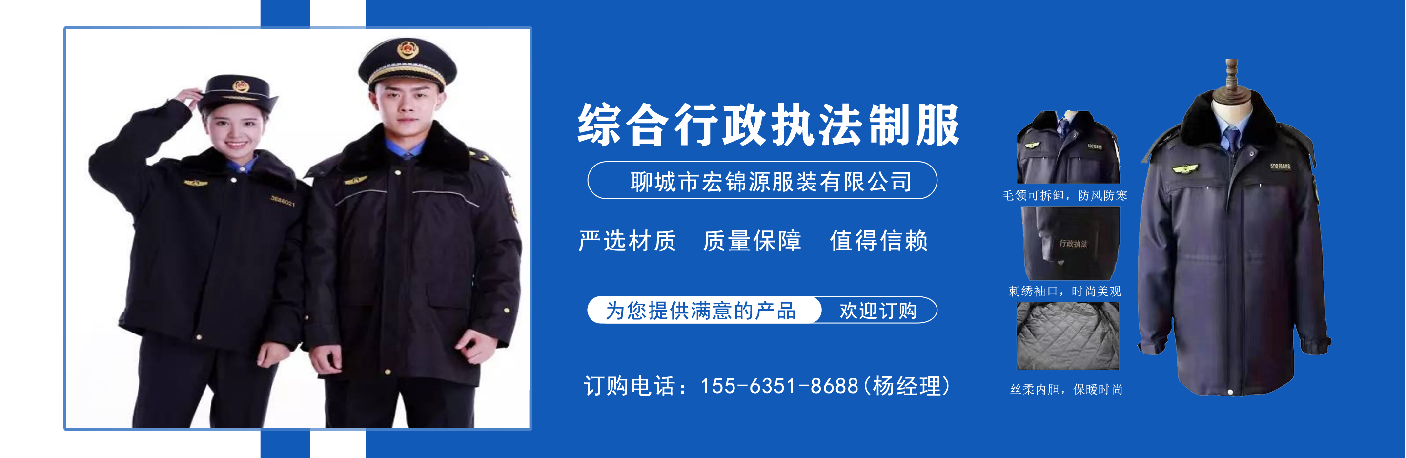 聊城市宏錦源服裝有限公司位于江北水城—山東聊城,地理位置優(yōu)越,交通便利。公司主營綜合行政執(zhí)法制服,交通執(zhí)法服裝,應(yīng)急管理執(zhí)法標(biāo)志服,市場監(jiān)督管理標(biāo)志服,農(nóng)業(yè)執(zhí)法服裝,生態(tài)環(huán)境保護(hù)制服,文化市場執(zhí)法服,城管標(biāo)志服裝廠,衛(wèi)生監(jiān)督制服,六部門標(biāo)志服廠家等,值得信賴! 公司生產(chǎn)的標(biāo)志服裝據(jù)有造型美、板型新、多次水洗不退色、不變型、不起泡?! 罢J(rèn)真辦事,踏實(shí)做人”是宏錦源的企業(yè)精神,我們的宗旨是:“用服務(wù)與真誠來換取你的信任與支持,互惠互利,共創(chuàng)雙贏!”我公司愿與國內(nèi)外各界同仁志士竭誠合作,共創(chuàng)未來企業(yè)目標(biāo):在已選定的服飾領(lǐng)域中,成為行業(yè)的卓越者。 經(jīng)營理念:追求產(chǎn)品卓越,為用戶提供完美、高效的服務(wù)。...
